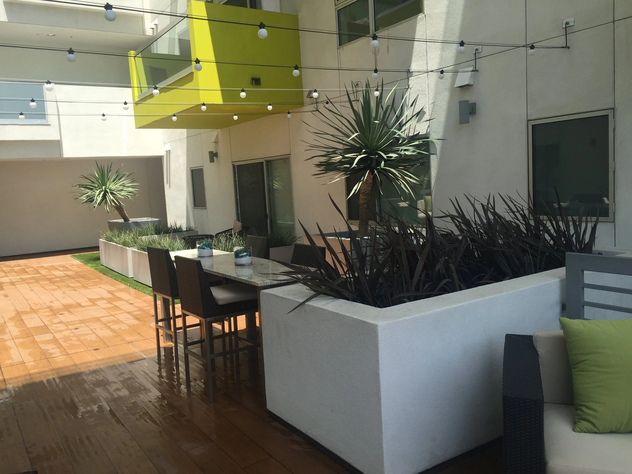 Hermann Design Group and Kyle Simon coordinated with the architect, civil engineer, soils engineer, and other project consultants to develop Landscape Infiltration Devices (LID planters) to manage storm water runoff for the five-story apartment project in Los Angeles. Landscape selections were made based upon the soil profile required to meet SWPP guidelines and horticultural requirements. Storm water runoff assists in natural irrigation as well as the use of drip irrigation techniques for supplemental watering.